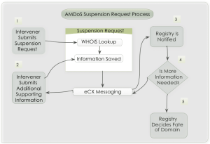 AMDoS orders and systematizes suspension requests through a formal process that ensures the credibility of malicious domain reporters and the integrity of their suspension requests − and speeds them on their way to the Registrars of record.