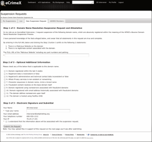 When an Accredited Intervener issues a Suspension Request via the Attestation page [Figure 1], AMDoS populates the new suspension request with the available data from a domain name WHOIS data query.