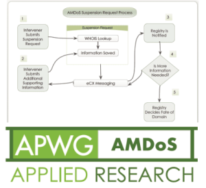 The APWG Malicious Domain Suspen sion (AMDoS) system enables Accredited Interveners to submit suspected malicious domain names for investigation and suspension by Sponsoring Registrars. AMDoS orders and systematizes suspension requests through a formal process that ensures the credibility of malicious domain reporters and integrity of their suspension requests − and speeds them on their way to the Registrars of record. The program, launched initially with 12 Registrys of gTLD and ccTLDs, is now suspended and being reconsidered as a notification system that would deliver attestations exclusively to Sponsoring Registrars, explicitly reflecting the update in the ICANN RAA contracts of 2013.